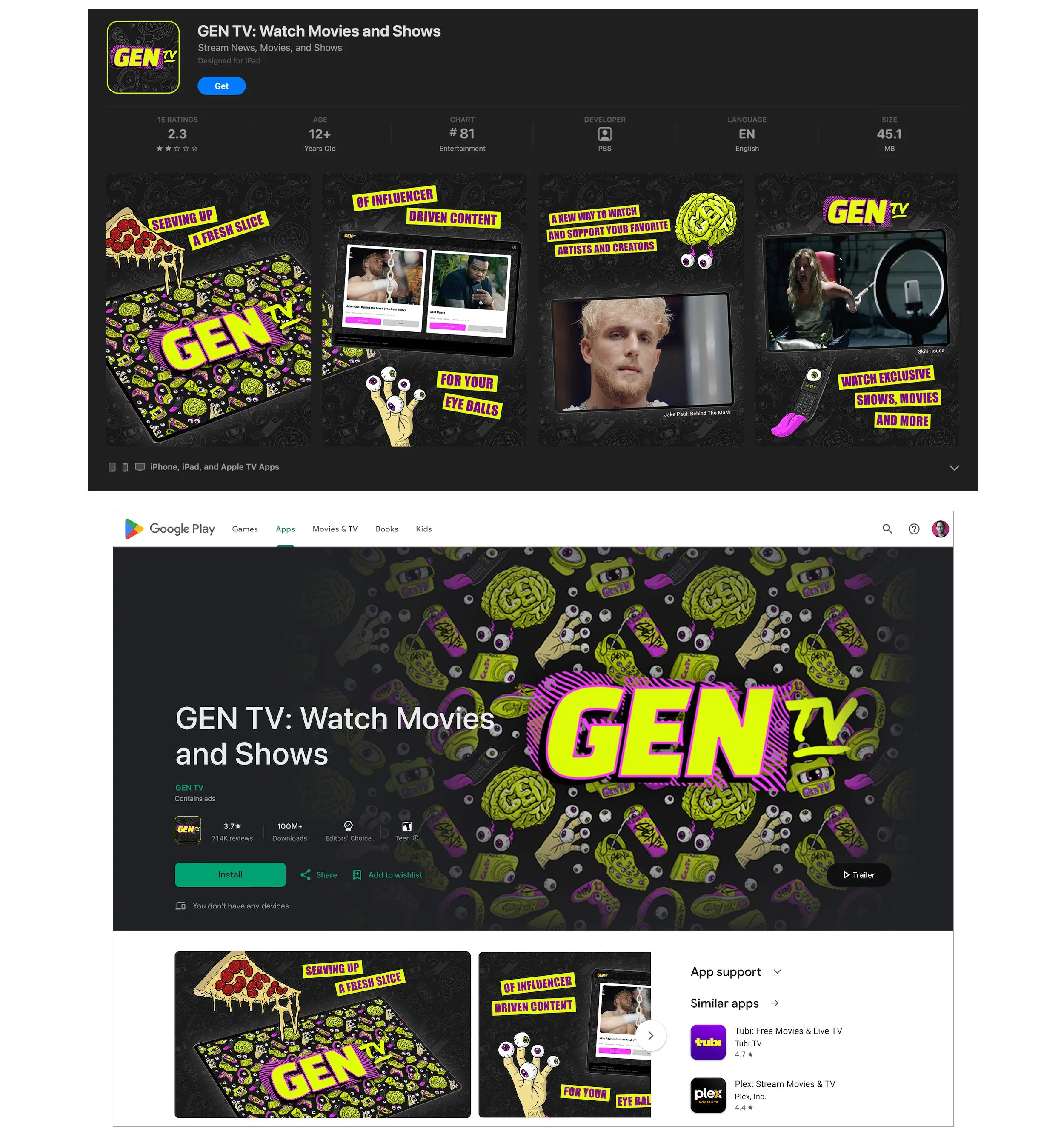GEN TV is an entertainment streaming service concept with a focus on social media influencer content, movies and shows. As associate creative director I was tasked with developing its initial brand identity. We took inspiration from pop, punk, and hip-hop culture letting our personal interests influence the direction. GEN TV’s innovative, creator focused business model along with its attitude and playfulness sets itself apart from the competition. I created the logo and a library of icons and illustrations. I worked with a team of product designers and developers in creating assets such as the website, mobile application, app store graphics, landing pages, and other digital marketing material.